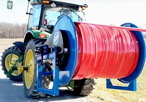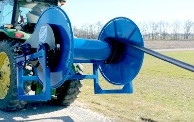 Open drum hose reels. 3 point hitch, single axle, or tandem axle. Several sizes available. Can hold from 3 to 10 hoses. Over 1 mile of hose all on 1 reel. Only one person required to layout and pick up hose.