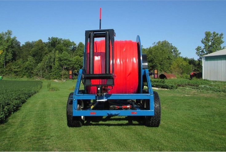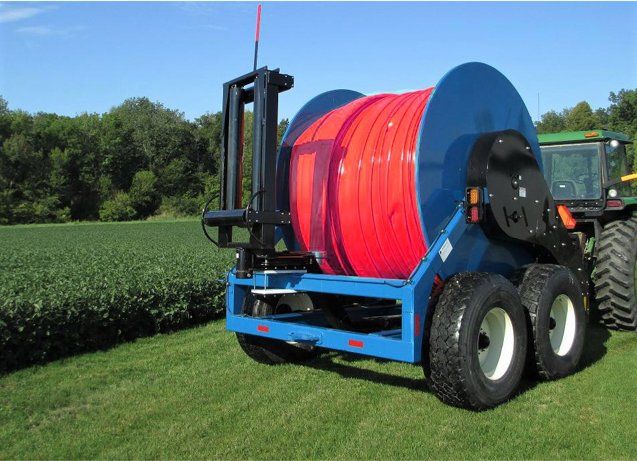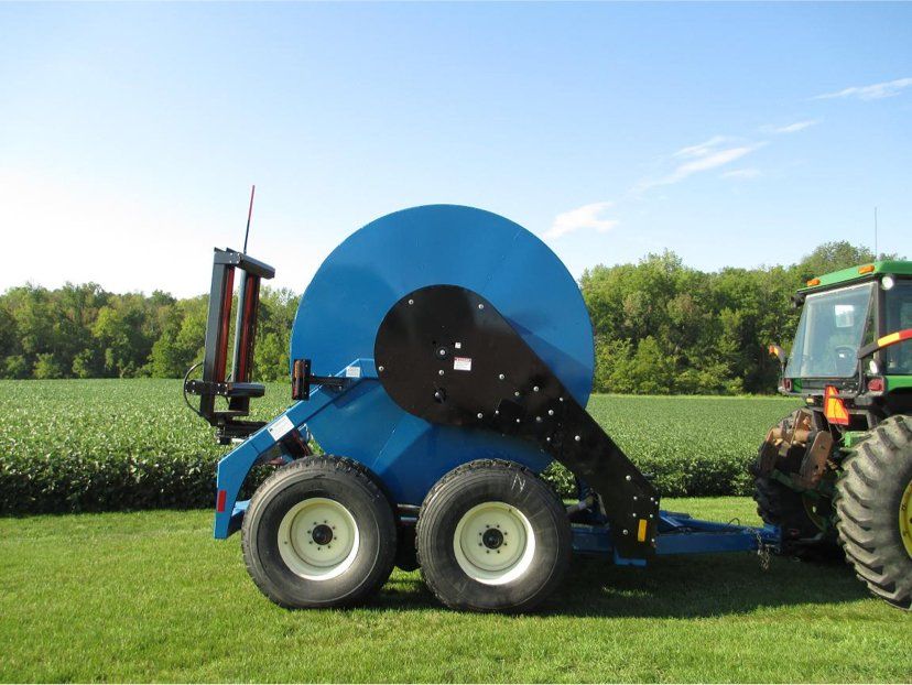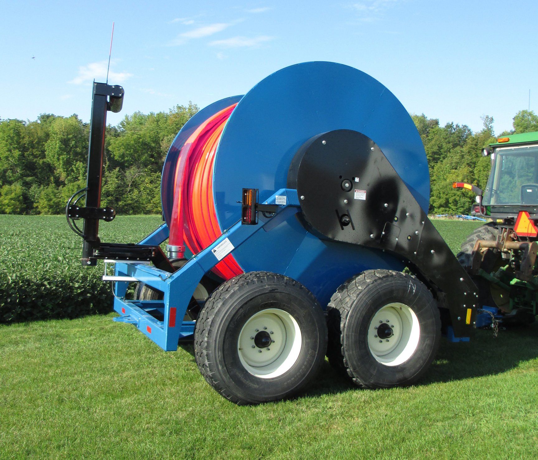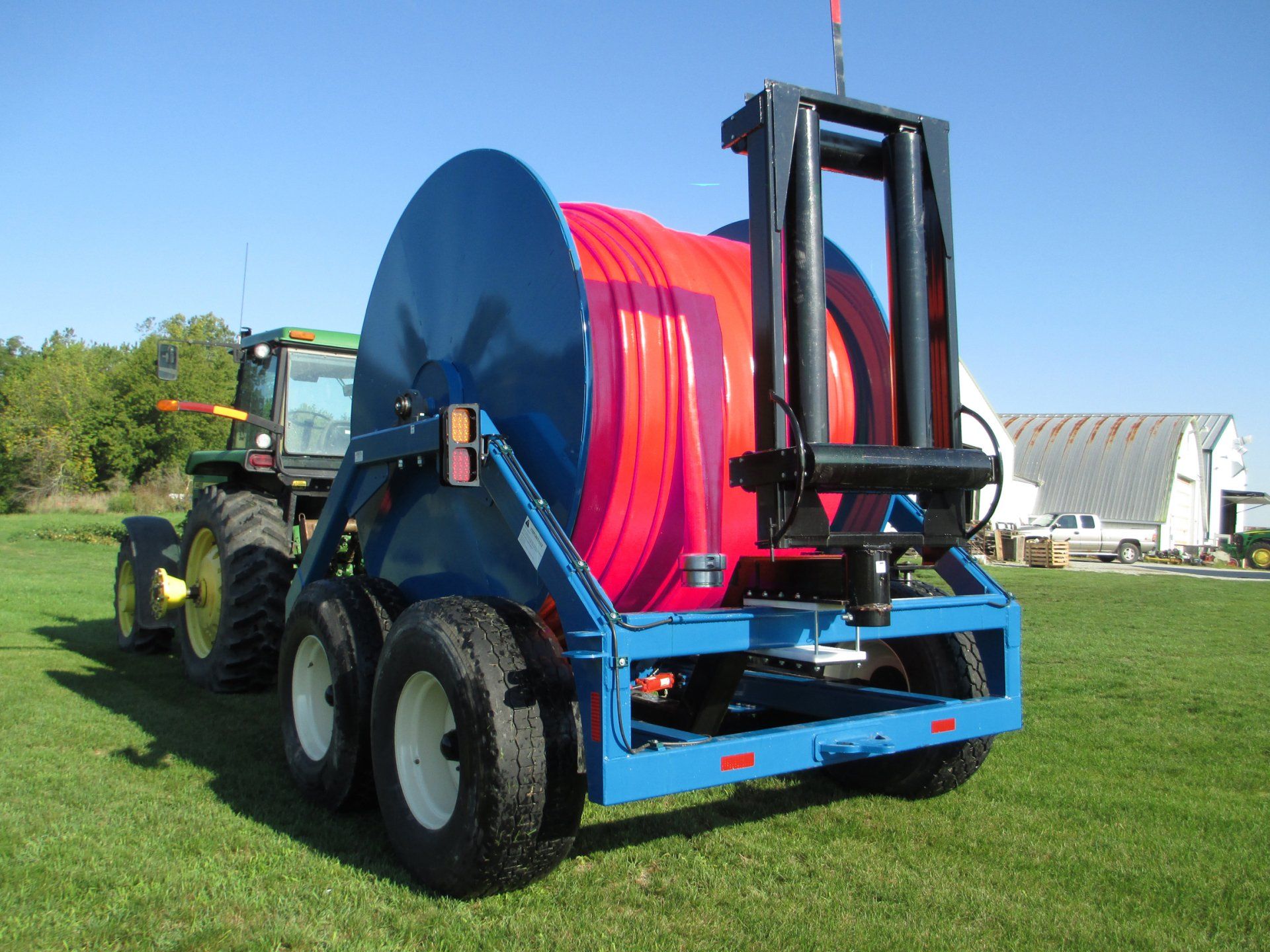 Open drum hose reels. 3 point hitch, single axle, or tandem axle. Several sizes available. Can hold from 3 to 10 hoses. Over 1 mile of hose all on 1 reel. Only one person required to layout and pick up hose.